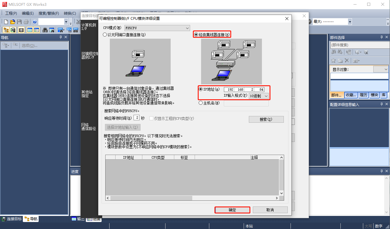 3、“CPU模式”設(shè)置,“經(jīng)由集線器連接”,填寫(xiě)控制器的IP地址。
