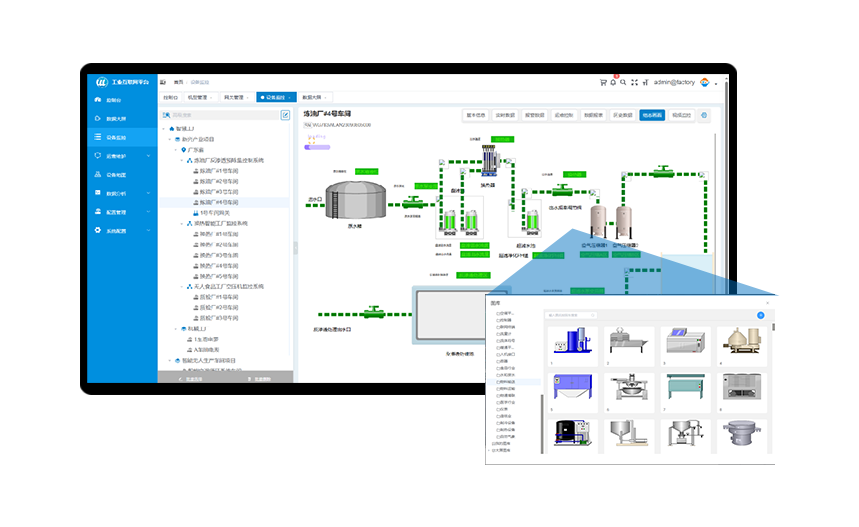 通過(guò)將網(wǎng)關(guān)的數(shù)據(jù)接入到物通博聯(lián)工業(yè)數(shù)據(jù)云平臺(tái),可以實(shí)現(xiàn)對(duì)PLC的數(shù)據(jù)進(jìn)行遠(yuǎn)程監(jiān)控,通過(guò)平臺(tái)的組態(tài)功能可以自由繪制組態(tài)監(jiān)控畫(huà)面,實(shí)現(xiàn)電腦端和手機(jī)端的設(shè)備運(yùn)行狀態(tài)和工藝流程的可視化組態(tài)監(jiān)控。