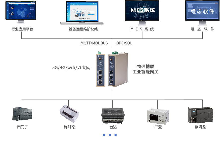 北向支持接入物通博聯(lián)云平臺(tái),客戶(hù)自主開(kāi)發(fā)的云平臺(tái),第三方云平臺(tái)(根云、美云、華為、阿里、百度、微軟等IOT云平臺(tái)),組態(tài)軟件、MES系統(tǒng)、行業(yè)監(jiān)控平臺(tái)等工業(yè)軟件