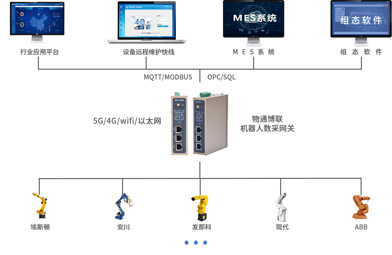 物通博聯(lián)機(jī)器人數(shù)采網(wǎng)關(guān)支持采集市面上大部分的機(jī)器人(機(jī)械手臂)設(shè)備(發(fā)那科、ABB、現(xiàn)代、安川、埃斯頓……等等)的運(yùn)行狀態(tài)、工藝參數(shù)、故障信息、生產(chǎn)數(shù)據(jù)等數(shù)據(jù),將數(shù)據(jù)接入工廠的MES系統(tǒng)、工廠的加工系統(tǒng)、數(shù)據(jù)庫(kù)及物聯(lián)網(wǎng)系統(tǒng)、物通博聯(lián)云平臺(tái)、設(shè)備管理平臺(tái)等,實(shí)現(xiàn)機(jī)器人設(shè)備的遠(yuǎn)程監(jiān)控和運(yùn)維,生產(chǎn)優(yōu)化與數(shù)據(jù)分析,有助于提高生產(chǎn)效率、降低成本、保障生產(chǎn)安全。