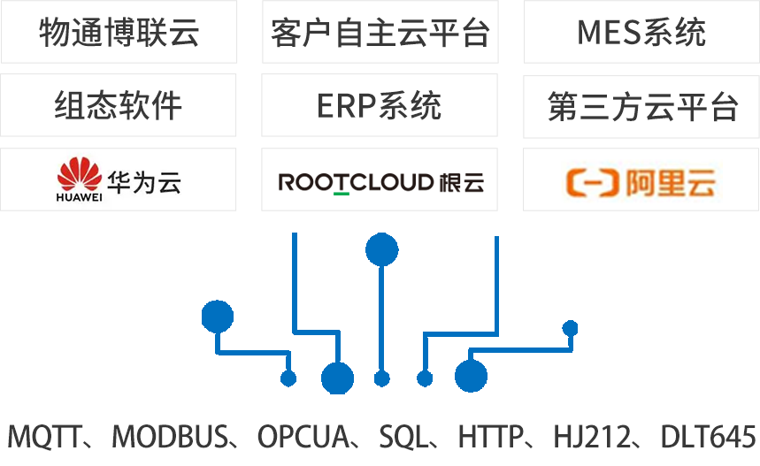 北向支持接入物通博聯(lián)云平臺(tái),客戶自主開發(fā)的云平臺(tái),第三方云平臺(tái)(根云、美云、華為、阿里、百度、微軟等IOT云平臺(tái)),組態(tài)軟件、MES系統(tǒng)、行業(yè)監(jiān)控平臺(tái)等工業(yè)軟件