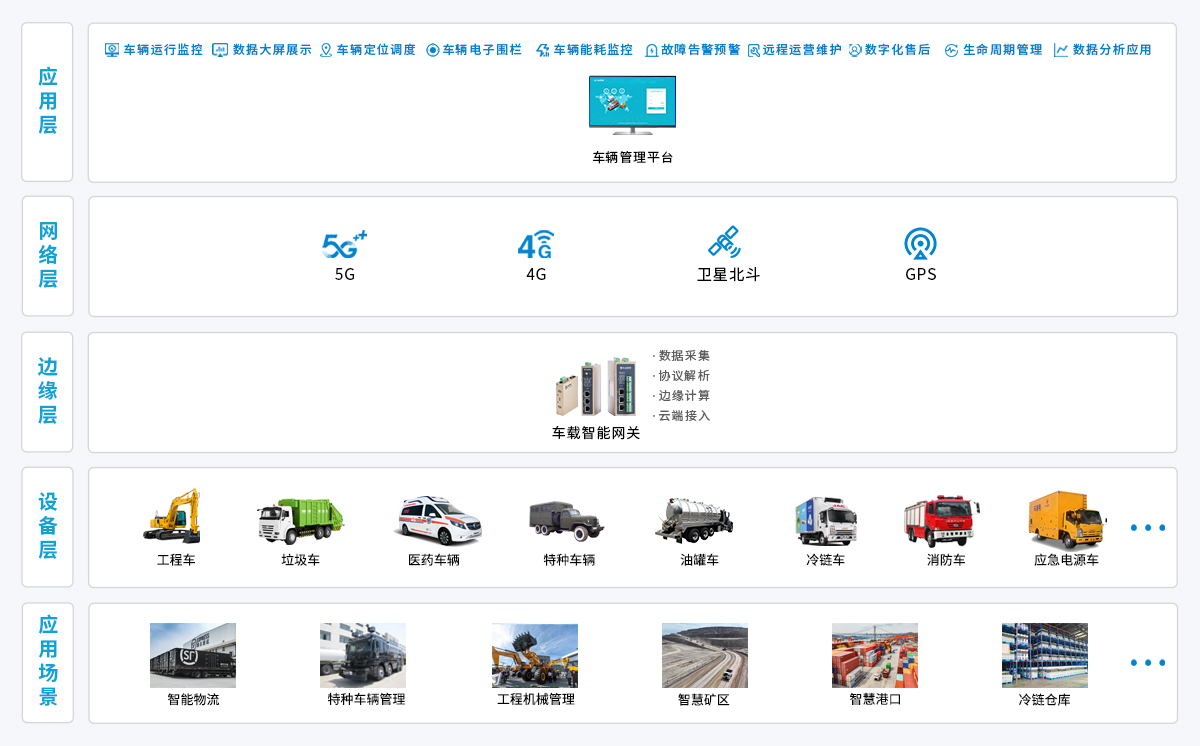 物通博聯(lián)針對(duì)特種車輛數(shù)字化需求,以車載智能網(wǎng)關(guān)為核心,實(shí)時(shí)采集車輛行駛參數(shù)、動(dòng)力系統(tǒng)狀態(tài)、作業(yè)設(shè)備工況等關(guān)鍵數(shù)據(jù),通過邊緣側(cè)本地化計(jì)算完成數(shù)據(jù)清洗、格式標(biāo)準(zhǔn)化處理。再依托 5G/4G 無線通信或北斗網(wǎng)絡(luò),將標(biāo)準(zhǔn)化數(shù)據(jù)上傳至特種車輛管理平臺(tái)。平臺(tái)實(shí)現(xiàn)車輛位置實(shí)時(shí)追蹤、運(yùn)行狀態(tài)遠(yuǎn)程監(jiān)控、異常情況及時(shí)預(yù)警,為特種車輛高效調(diào)度與安全管理提供技術(shù)支撐。
