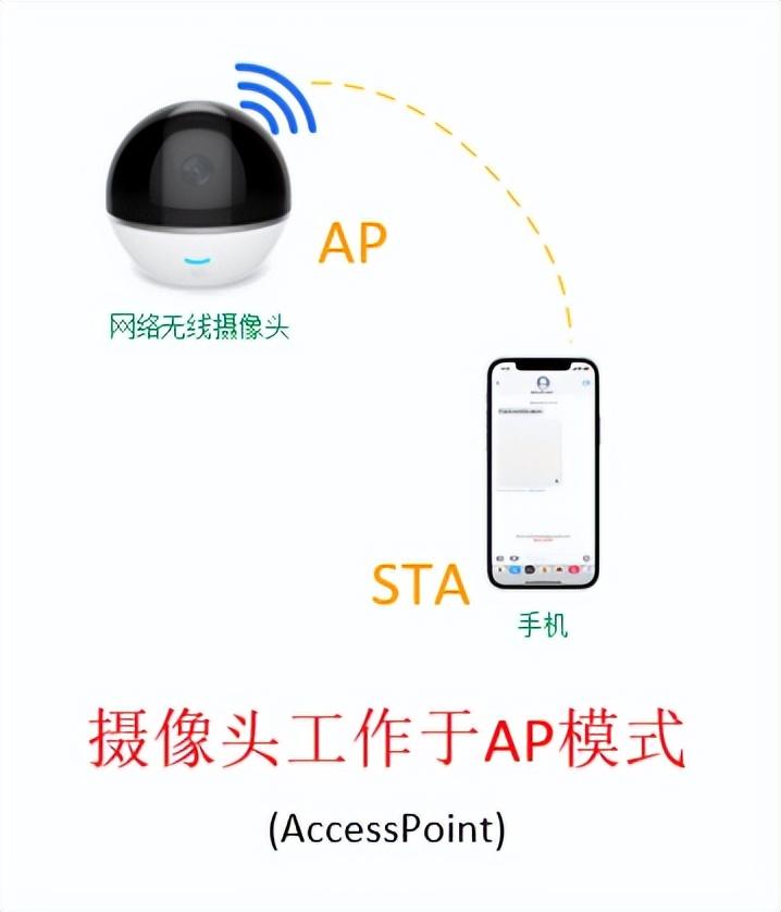 不過,這些 “其它設(shè)備” 不是始終工作在STA模式的,比如無線攝像頭,在剛買回來進(jìn)行Wi-Fi配網(wǎng)時,它的Wi-Fi就會先工作于AP模式,即這個攝像頭是一個無線熱點(diǎn),如下圖,我們的手機(jī)可以連接到這個熱點(diǎn),可以給它發(fā)送家里的路由器的Wi-Fi名稱與密碼,這樣攝像頭就能實(shí)現(xiàn)聯(lián)網(wǎng)了,即實(shí)現(xiàn)了設(shè)備的Wi-Fi配網(wǎng)。當(dāng)然,這只是其中一種配網(wǎng)方式,還有許多其它方式可以實(shí)現(xiàn)物聯(lián)網(wǎng)設(shè)備的Wi-Fi配網(wǎng)。