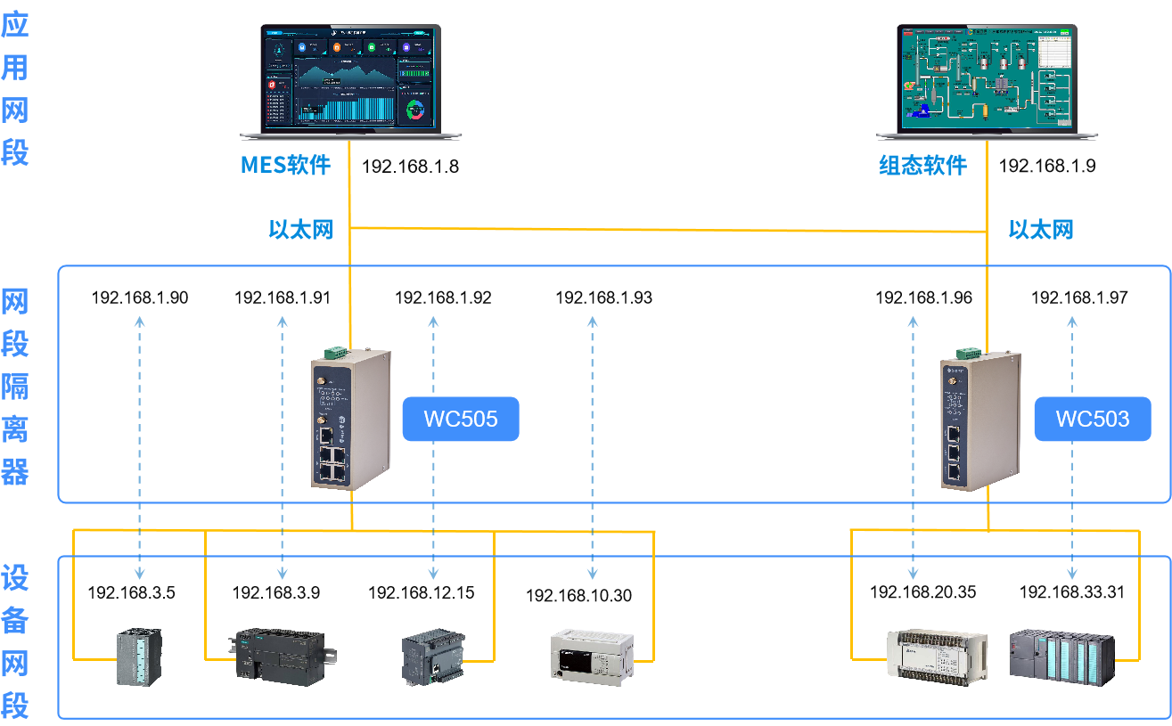 物通博聯(lián)WC系列網(wǎng)段隔離器適用于生產(chǎn)網(wǎng)絡(luò)對(duì) PLC、HMI、CNC、DCS、MES等網(wǎng)絡(luò)通訊和數(shù)據(jù)采集,兼有跨網(wǎng)段隔離和IP轉(zhuǎn)換的功能。車(chē)間多個(gè)設(shè)備,如果有不同網(wǎng)段的IP地址,則可以統(tǒng)一成同一網(wǎng)段的IP地址,進(jìn)行設(shè)備(PLC、CNC)的在線(xiàn)編程、數(shù)據(jù)采集、遠(yuǎn)程管理等各種跨網(wǎng)段訪(fǎng)問(wèn)。