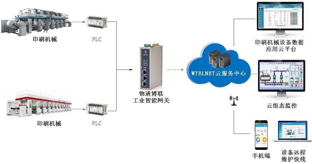 物通博聯(lián)利用WG系列工業(yè)智能網(wǎng)關(guān)作為連接設(shè)備和監(jiān)控系統(tǒng)的橋梁,實(shí)現(xiàn)印刷機(jī)械設(shè)備數(shù)據(jù)的遠(yuǎn)程監(jiān)控和維護(hù),為印刷企業(yè)提供更加智能化的印刷機(jī)械設(shè)備遠(yuǎn)程監(jiān)控智能運(yùn)維解決方案。