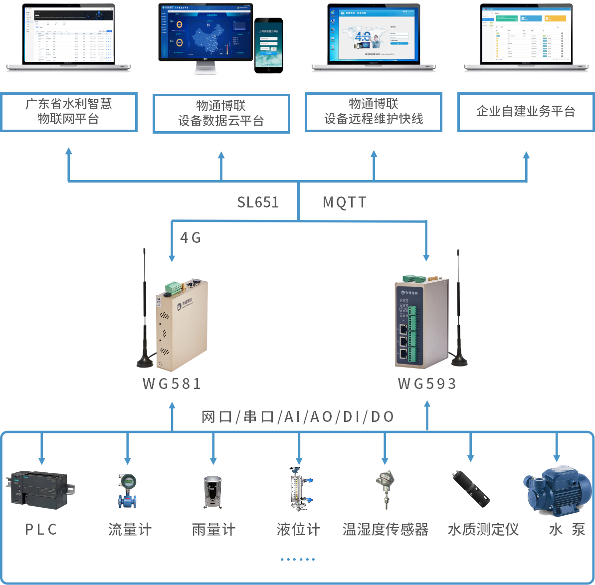 通過物通博聯(lián)工業(yè)智能網(wǎng)關(guān)采集PLC、流量計(jì)、溫濕度傳感器、雨量計(jì)、液位計(jì)等等相關(guān)設(shè)備數(shù)據(jù),將流量、流速、水位、水深、溫度、濕度、水壓等等數(shù)據(jù)通過邊緣計(jì)算、數(shù)據(jù)標(biāo)準(zhǔn)化后以4G/WIFI等網(wǎng)絡(luò)方式通過MQTT/SL651等協(xié)議傳輸?shù)綇V東省水利智慧物聯(lián)網(wǎng)平臺(tái)或者企業(yè)自建業(yè)務(wù)平臺(tái)。
