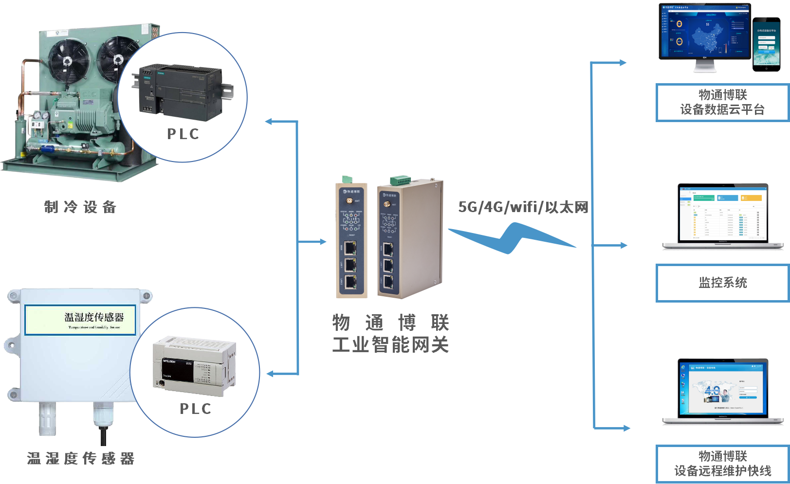 無(wú)論是食品冷鏈中的生產(chǎn)、運(yùn)輸還是存儲(chǔ)環(huán)節(jié),需要監(jiān)測(cè)的設(shè)備都是制冷設(shè)備與傳感器。通過(guò)將物通博聯(lián)工業(yè)智能網(wǎng)關(guān)接入制冷設(shè)備PLC與溫濕度傳感器,網(wǎng)關(guān)就能實(shí)時(shí)采集溫濕度、壓力及電壓、電流等數(shù)據(jù),并通過(guò)5G/4G/WIFI/以太網(wǎng)等網(wǎng)絡(luò)將數(shù)據(jù)傳輸?shù)皆贫吮O(jiān)控平臺(tái)。