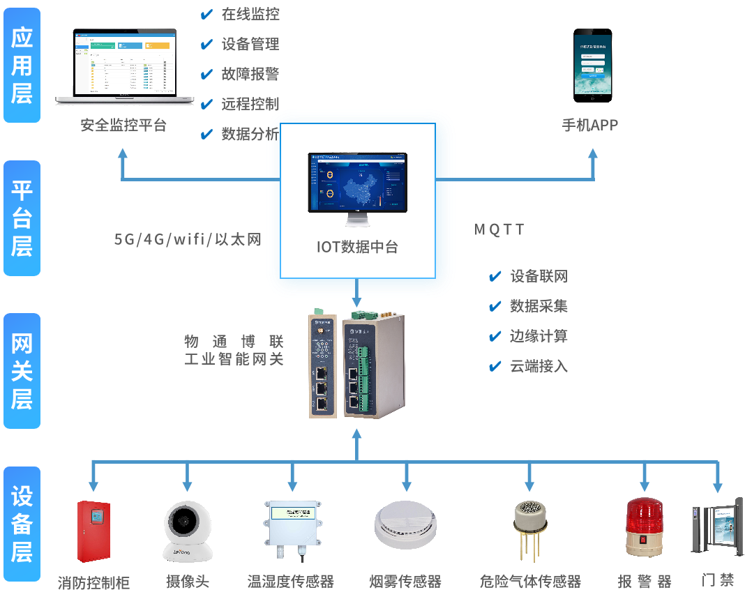實(shí)現(xiàn)對溫度、壓力、流量、可燃?xì)怏w濃度及消防設(shè)備開關(guān)狀態(tài)等信息進(jìn)行可視化展示,并通過手機(jī)端電腦端對設(shè)備數(shù)據(jù)進(jìn)行實(shí)時監(jiān)控、管理與分析,及時捕捉到潛在的安全隱患,如燃?xì)庑孤毫Ξ惓5取?/span>