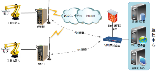 監(jiān)控中心端采用ADSL/光纖接入Internet 公網(wǎng),獲取固定公網(wǎng)ip。搭建vpn服務(wù)器。物通博聯(lián)工業(yè)無線路由WR515做vpn客戶端和服務(wù)器建立vpn隧道,實現(xiàn)兩端內(nèi)網(wǎng)互通。數(shù)據(jù)庫服務(wù)器上運行采集系統(tǒng),可以采集工業(yè)無線路由WR515下接的以太網(wǎng)plc數(shù)據(jù)以及工業(yè)機器人數(shù)據(jù),從而達到采集監(jiān)控工業(yè)機器人運行狀態(tài)目的。
