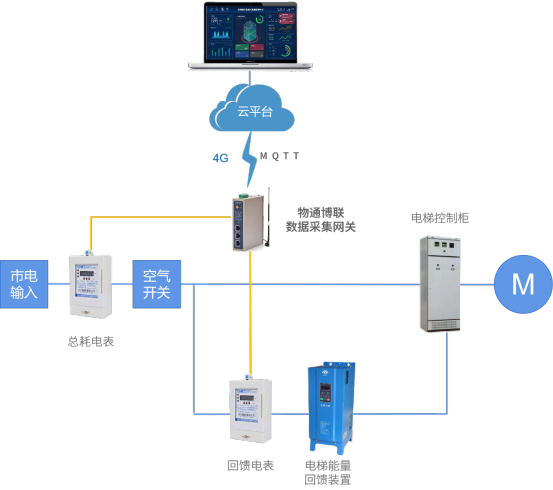 物通博聯(lián)樓宇電梯節(jié)能項(xiàng)目遠(yuǎn)程監(jiān)控系統(tǒng),通過(guò)物通博聯(lián)數(shù)據(jù)采集網(wǎng)關(guān)與現(xiàn)場(chǎng)的電表連接(一般為2個(gè)電表,一個(gè)是在空氣開(kāi)關(guān)前的市電輸入電表,采集電梯耗電量,一個(gè)是電梯能量回饋裝置出線位置的電表,采集電梯能量回饋裝置發(fā)電量),網(wǎng)關(guān)采集電表數(shù)據(jù)通過(guò)4G上網(wǎng),發(fā)送到客戶(hù)自主監(jiān)控平臺(tái)軟件,在平臺(tái)軟件上對(duì)數(shù)據(jù)進(jìn)行分析計(jì)算,分析得出電梯的節(jié)電率和節(jié)能情況。