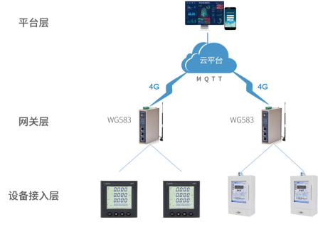 針對項目現(xiàn)場與需求,物通博聯(lián)提供一套產(chǎn)業(yè)園能耗監(jiān)測物聯(lián)網(wǎng)解決方案,通過物通博聯(lián)·工業(yè)智能網(wǎng)關(guān)WG583與電表RS485串口通信連接,采集能耗數(shù)據(jù)并通過MQTT協(xié)議Json格式傳輸?shù)皆品?wù)器中,在客戶云平臺中實現(xiàn)能耗遠程監(jiān)測、自動預(yù)警、成本核算、數(shù)據(jù)分析等功能,減輕巡檢工人的勞動強度,降低人工成本,同時也能為減少能源浪費、提高能源利用效率提供可靠數(shù)據(jù)支持。
