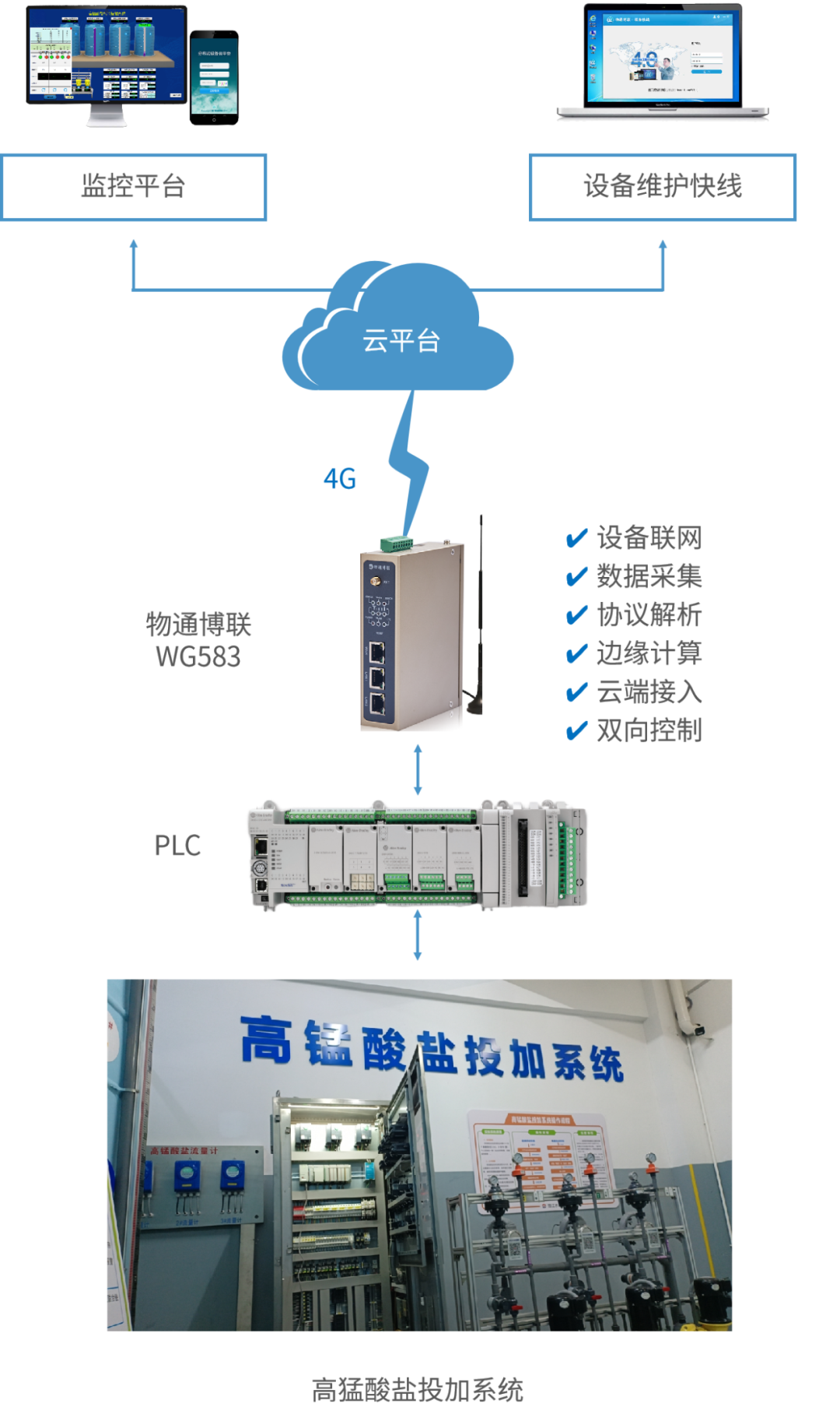 該自來水公司是一家致力于“供排水一體化、城鄉(xiāng)水務一體化、投資建設運營一體化”的水務一體化運營企業(yè)。本次項目使用物通博聯(lián)工業(yè)智能網(wǎng)關(guān)+IOT云平臺搭建高錳酸鹽投加設備物聯(lián)網(wǎng)系統(tǒng),旨在實現(xiàn)對自來水廠水務進行智慧管理,確保穩(wěn)定高效運行。