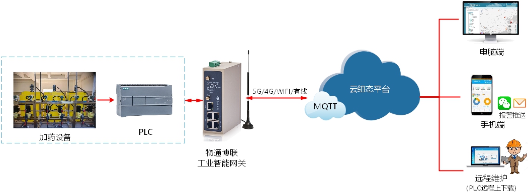 物通博聯(lián)提供污水處理加藥設(shè)備云組態(tài)遠(yuǎn)程監(jiān)控系統(tǒng)方案。通過(guò)將物通博聯(lián)工業(yè)智能網(wǎng)關(guān)接入加藥設(shè)備控制器 PLC,實(shí)時(shí)采集數(shù)據(jù)并通過(guò)5G/4G/WIFI/以太網(wǎng)等網(wǎng)絡(luò)對(duì)接到物通博聯(lián)云組態(tài)平臺(tái)中,進(jìn)行編輯繪制搭建組態(tài)大屏,從而直觀展示污水處理加藥設(shè)備的運(yùn)行狀態(tài)與工藝參數(shù),并在出現(xiàn)異常時(shí)自動(dòng)告警,從而靈活運(yùn)用遠(yuǎn)程控制、遠(yuǎn)程維護(hù)、數(shù)據(jù)分析等手段,提高工作效率并減少人工成本,保障污水處理工作安全、高效開(kāi)展。