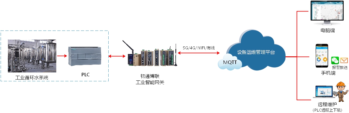 通過將物通博聯(lián)工業(yè)智能網(wǎng)關(guān)接入循環(huán)回水設(shè)備PLC中,能夠?qū)崟r采集進水溫度、出水溫度、加藥量、循環(huán)水量、排污水量、管網(wǎng)壓力、閥門開關(guān)、水質(zhì)參數(shù)等數(shù)據(jù),并通過5G/4G/WIFI/以太網(wǎng)等方式對接到設(shè)備運維管理平臺中,實現(xiàn)設(shè)備遠程監(jiān)控、組態(tài)展示、故障告警、遠程控制、遠程維護與數(shù)據(jù)統(tǒng)計分析等功能,提供高效可靠的工作手段,有助于提高工作效率與管理水平,實現(xiàn)降本增效。