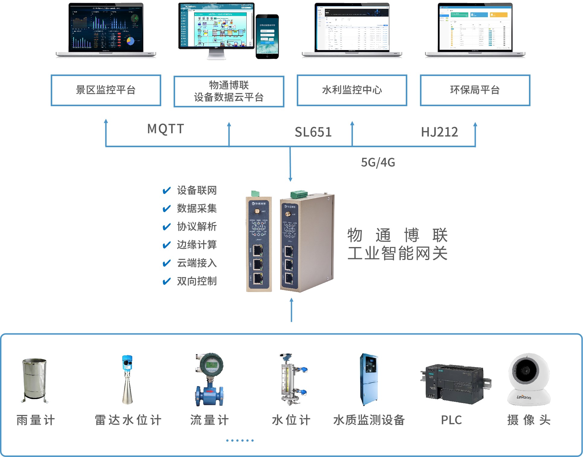 采集水位、降雨量、流量、水質(zhì)、濁度、視頻等多維度數(shù)據(jù),并通過(guò)無(wú)線網(wǎng)絡(luò)5G/4G傳輸?shù)骄皡^(qū)管理平臺(tái)和水利管理平臺(tái)中進(jìn)行實(shí)時(shí)監(jiān)控。