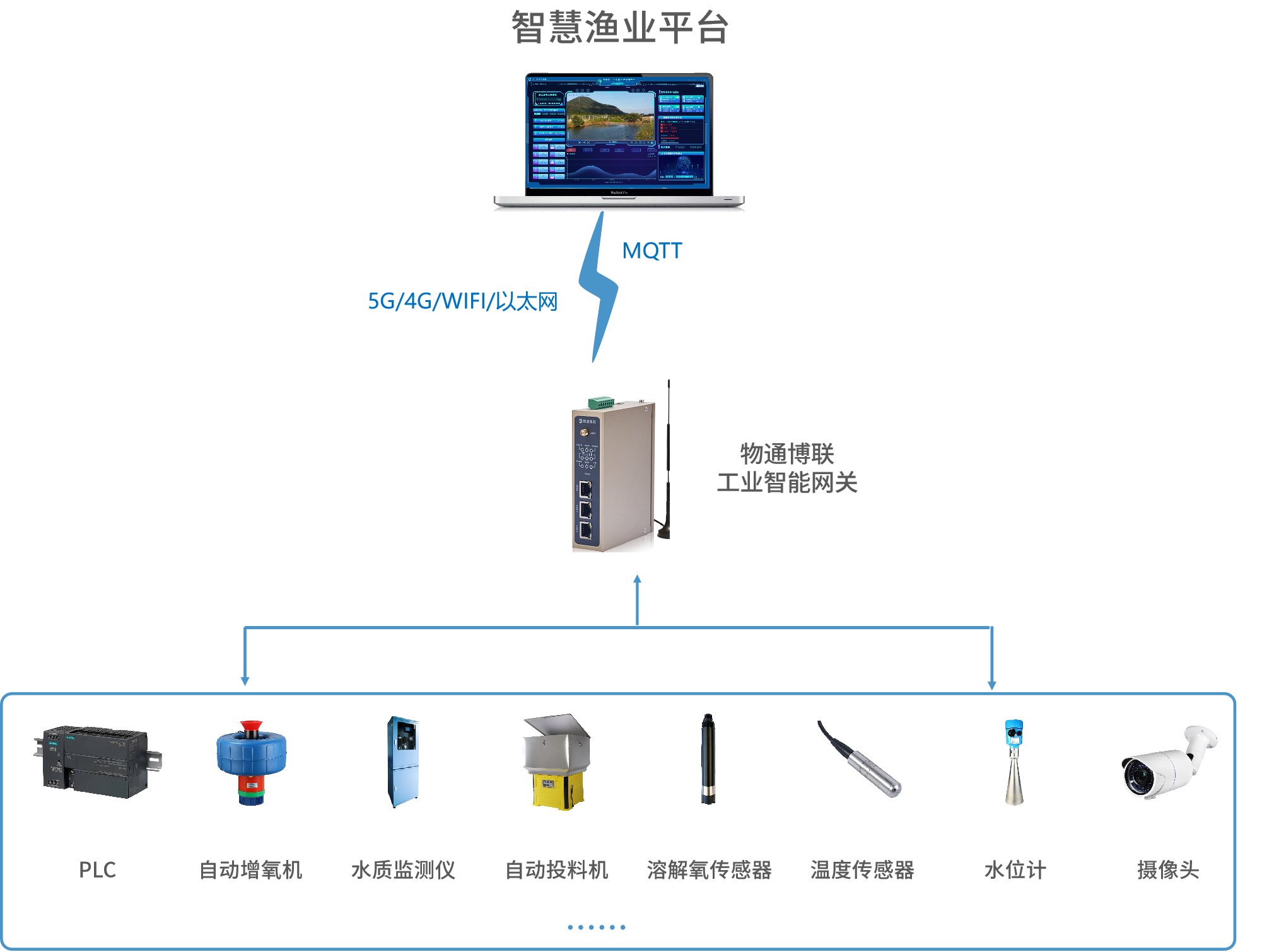 實時采集溫度傳感器、水質(zhì)監(jiān)測儀、PLC、攝像頭等設(shè)備并對接到智慧漁業(yè)云平臺或現(xiàn)場監(jiān)控大屏中,確保數(shù)據(jù)采集通信的安全性與完整性。